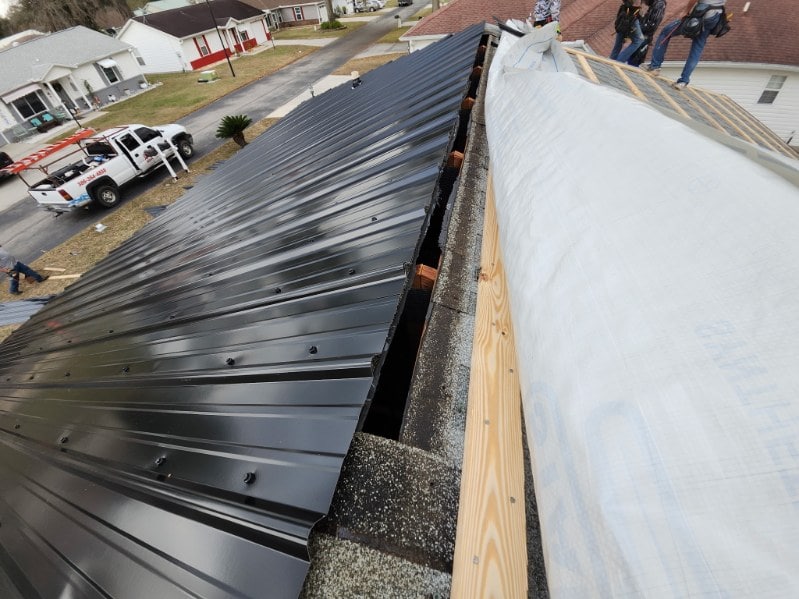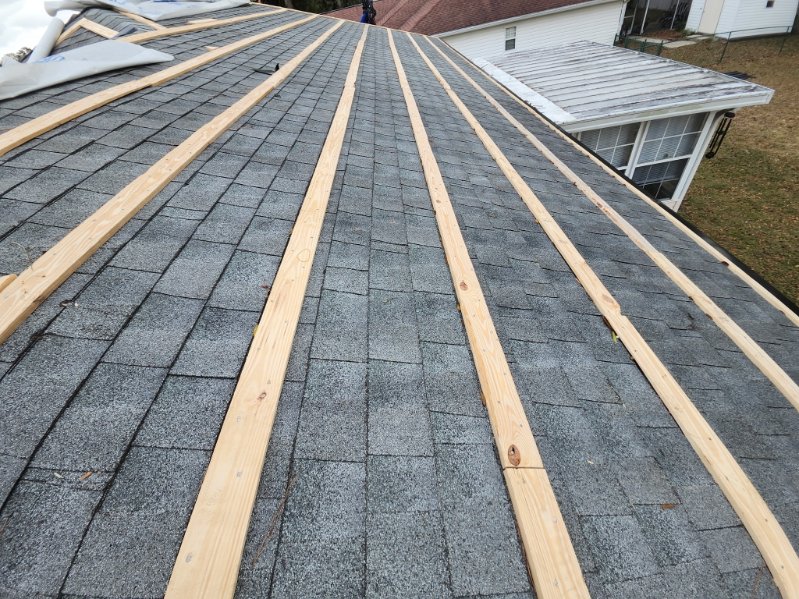 Explain if not removing the existing roofing material? Metal roof over existing shingles, installing pine 1x4 lathing every 2ft on center.
