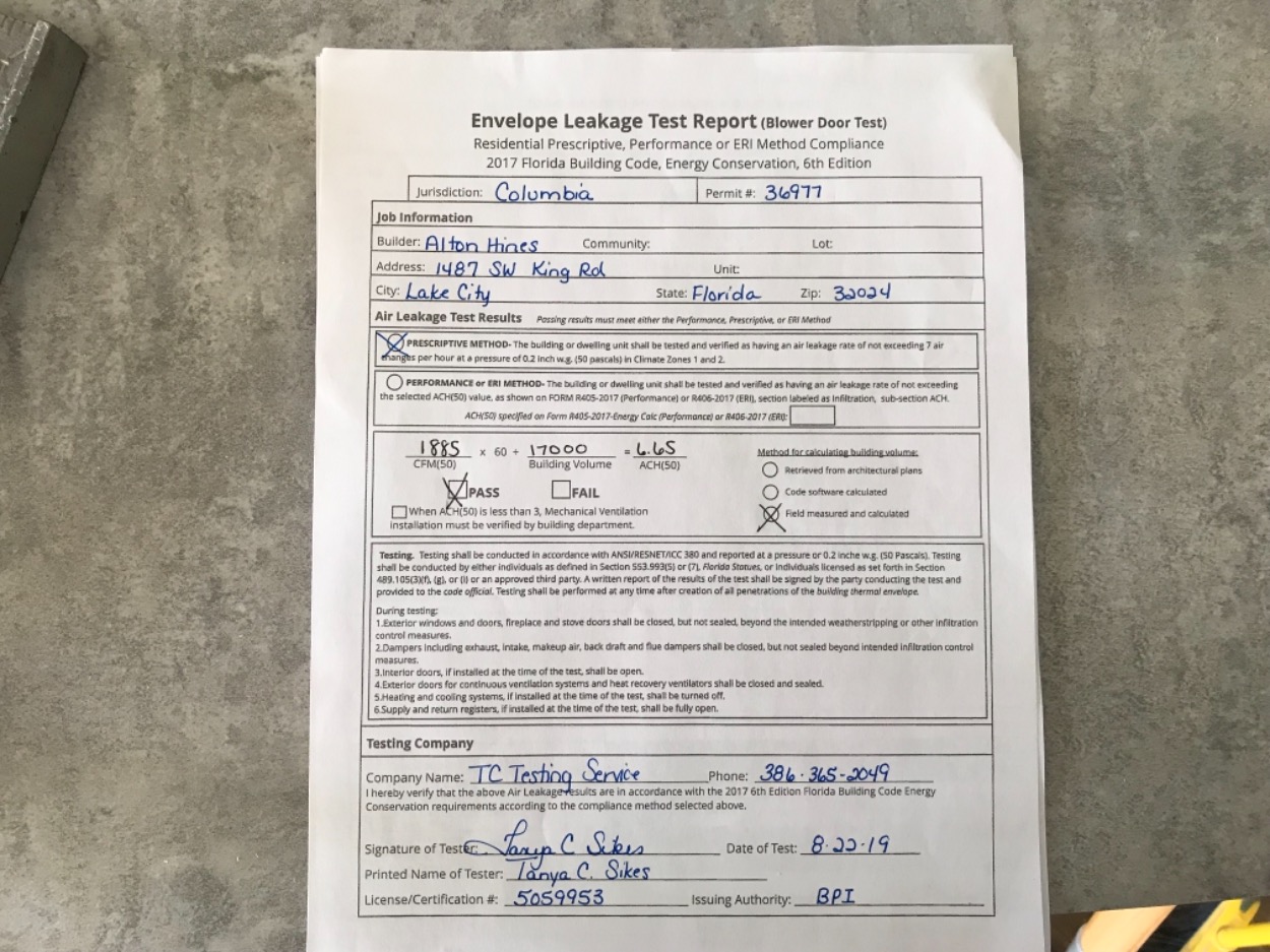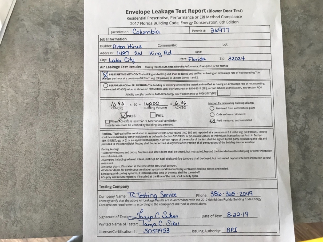 Passed: Building - Final Blower Door Test Received Plumbing Connected Troy Crews 9/3/2019